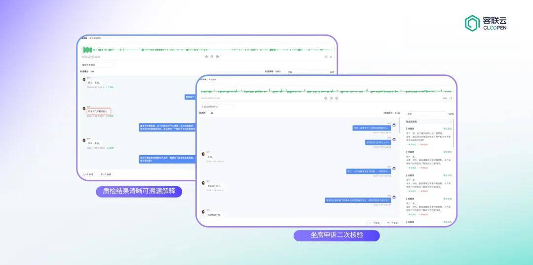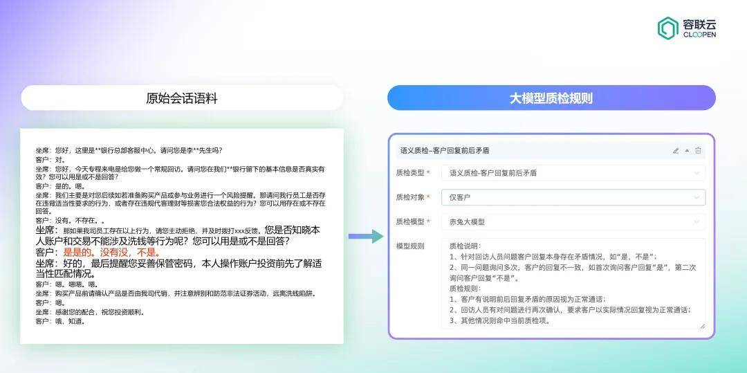 容联云大模型质检系统可通过上下文语义关联比对,准确识别“客户回复前后矛盾”,并标记为高风险,触发人工复检,有效防范因回访不到位引发的后续合规隐患。