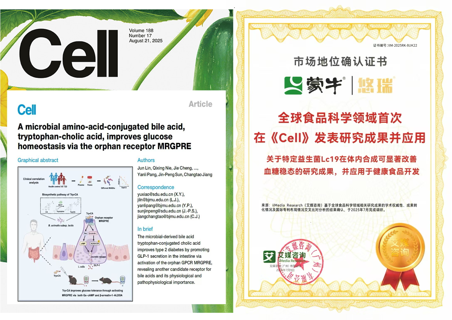 尤其值得一提的是,在微生态研究方面,蒙牛研发的具有自主知识产权的益生菌菌株Lc19,首次揭开了TRP-CA调控血糖的新机制,登上国际顶刊《CELL》,给全球血糖管理交出了“中国方案”。