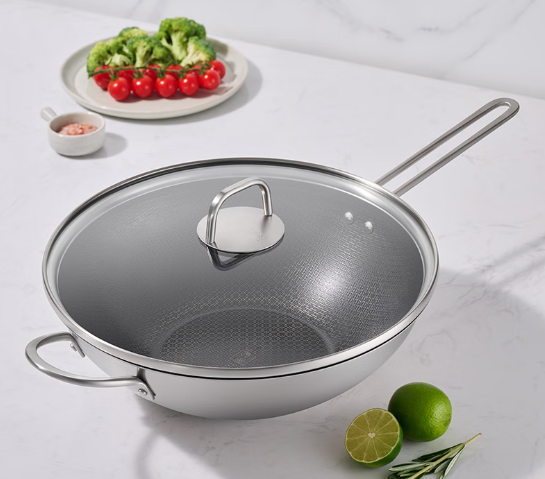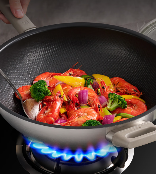钛陶瓷覆面蜂窝炒锅,通过先进的钛陶瓷覆面技术与蜂窝结构设计,实现了健康不粘的烹饪体验。真有钛,更健康,不含PFOA等有害物质,让消费者无需担忧烹饪中的安全问题,尽享安心便捷的料理时光。这款炒锅兼具健康安全与实用功能,通过蜂窝结构增强了产品的耐用性和不粘性能,同时具有卓越的耐磨性和耐腐蚀性,使用寿命远超传统涂层。