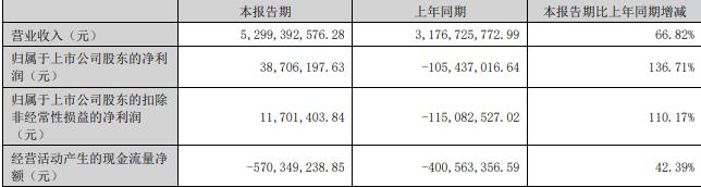 据公司2025年半年报,报告期内,公司实现营业收入53.00亿元,同比增长66.82%;归属于上市公司股东的净利润3870.62万元,同比增长136.71%;扣除非经常性损益后的净利润1170.14万元,同比增长110.17%;经营活动产生的现金流量净额-5.70亿元。
