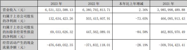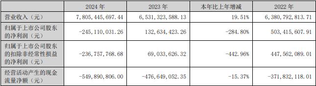 据公司2024年年报,报告期内,公司实现营业收入78.05亿元,同比增长19.51%;实现归属于上市公司股东的净利润-2.45亿元,上年为1.33亿元;实现归属于上市公司股东的扣除非经常性损益的净利润-2.37亿元,上年为6903.36万元;经营活动产生的现金流量净额为-5.50亿元,2023年为-4.77亿元,2022年为-3.72亿元,2021年为-3.10亿元。
