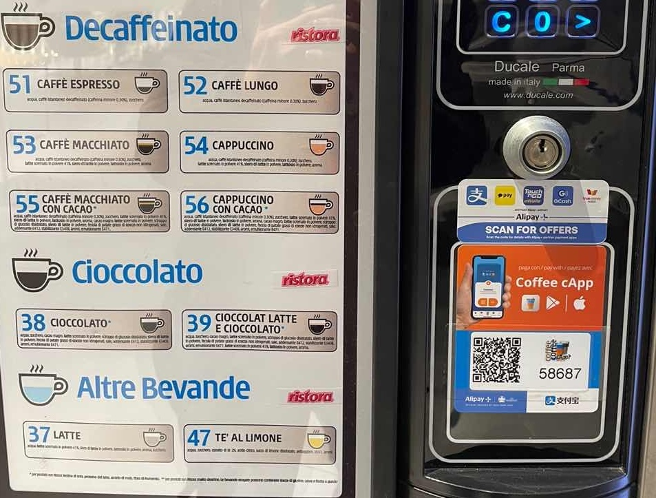 (图说:中国游客去欧洲,想要喝一杯无人值守咖啡机,也能用支付宝)
