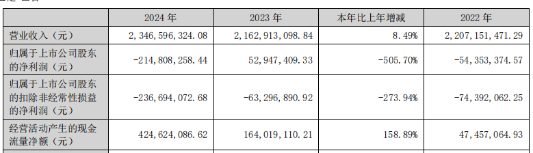2022年至2024年,公司实现归属于上市公司股东的扣除非经常性损益的净利润分别为-7439.21万元、-6329.69万元、-2.37亿元。