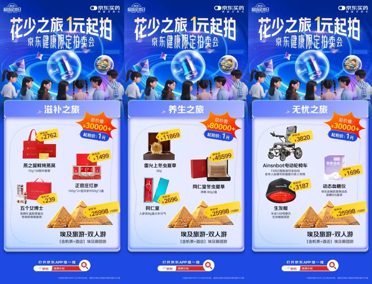 京东买药此次超品日不仅精准切中当下年轻人的进补新风气,更通过丰富品类、贴心场景组合和大力补贴,让每个人都能找到适合自己的“补法”,实现“科学进补”。9月15日晚8点,打开京东APP,搜“健康补贴”到京东买药超级品类日会场,不但可以购买自己心仪的健康好物,还能够从右下方“1元拍卖”进入“京东健康限定拍卖会”,1元起拍总价值15万元的花少之旅礼盒系列!