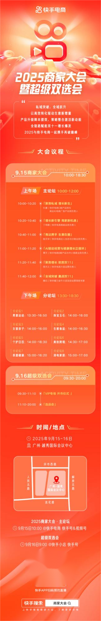 在主论坛之后,快手电商将举办各行业分论坛,包括男装运动、珠宝玉石、女装亲子、生鲜食品、个护日百、美妆跨境、茶酒健康、消电家居等行业,覆盖全品类商家及达人,以更为精细化、专业化的角度,为商家达人提供针对双11大促的定制化成长策略,拓展发展机遇。9月16日,快手电商将举办双11超级双选会,规模预计达1100人以上,来自广州以及全国各地的商家、达人、品牌方等将齐聚越秀国际会议中心,共同探讨大促商机。
