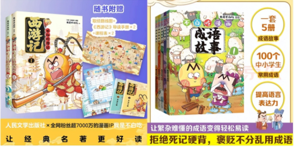 《不白吃漫话西游记》不仅真实还原了原著细节,更通过漫画形式打破了文字壁垒,使低龄儿童也能轻松接触并理解《西游记》这一经典故事;还有《不白吃漫画成语故事套装》,贴合中小学教材内容,让孩子们在轻松愉快的氛围中学习成语,理解成语的含义和用法,提高语言表达能力和文学素养。