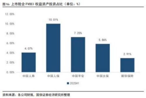 受资本市场波动及资产配置结构差异等因素影响 ,5家上市险企实现投资类收益表现分化 。截至2025年中期 ,新华保险、 中国人保、 中国人寿、 中国太保实现总投资收益 5.9%、5.1%、3.3%、2.3%, 同比+1.1%/+1.0%/-0.3%/-0.4%。 险资持续加大 FVOCI 权益类资产配置力度 ,以平安系为代表的上市险企通过举牌形式加大对港股等优质上市公司的投资力度。截至 2025 年中期 , 中国人寿 、 中国平安、 中国人保 、 中国太保、新华保险 FVOCI 权益类资产占金融类资产的 比例分别为 4%/7%/10%/6%/3% , 同比均有大幅提升 。