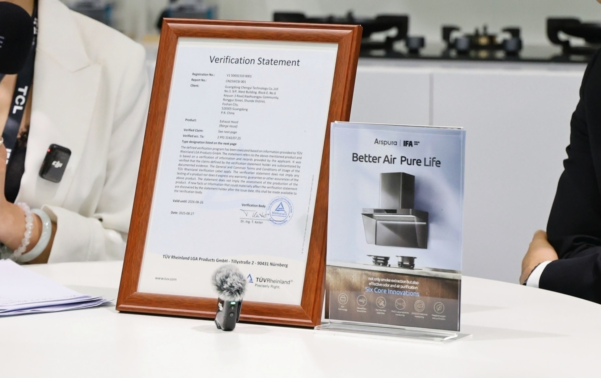IFA发布会现场,澄一科技净烟机更是凭借IQV技术,获颁德国莱茵TüV性能验证证书。莱茵产品服务事业群全球销售副总裁Henk Pieters在颁布现场表示,创新的IQV捕集技术在细颗粒物控制方面展现了卓越的性能。凭借超过13 m/s的超高风速,以及独特的三种气流组合控制技术,它为防止厨房油烟污染泄漏与健康守护树立了新的标杆。这不仅是厨房创新领域的卓越成就,也是整个行业的重要突破。