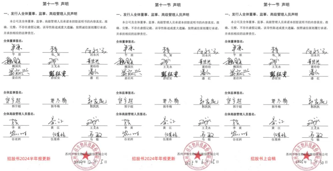 对比公司招股书2024半年报更新版、2024年报更新版及上会稿三份文件,发现“发行人全体董监高声明”页存在明显异常,三份文件的签署时间分别为2024年12月5日、2025年6月25日及2025年7月30日,间隔最长达7个多月。按照商业文书签署的基本常识,不同时间、不同场景下的亲笔签名,必然会在笔墨轻重、笔画力度、签名位置、字体倾斜角度等方面存在细微差异。