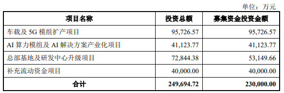 移远通信于6月11日披露的《2025年度向特定对象发行A股股票募集说明书(申报稿)》显示,本次向特定对象发行股票募集资金总额不超过230,000.00万元(含本数),扣除发行费用后的募集资金净额将全部用于以下项目:车载及5G模组扩产项目、AI算力模组及AI解决方案产业化项目、总部基地及研发中心升级项目、补充流动资金项目。