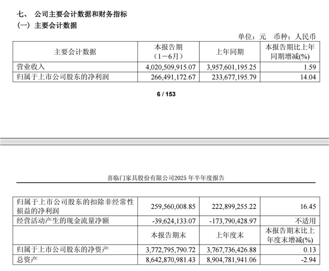半年报显示,喜临门2025年上半年实现营业收入40.21亿元,同比增长1.59%;归母净利润2.66亿元,同比增长14.04%;扣非净利润增速为16.45%,显示公司主营业务盈利能力持续增强。