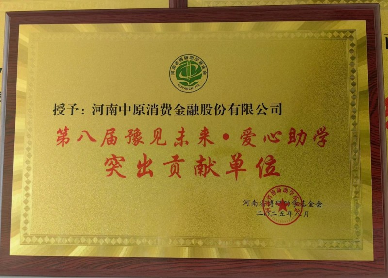 8 月 30 日,第八届 “豫见未来・爱心助学” 捐赠仪式在郑州隆重举行。该活动由河南省博研助学基金会主办,中原消费金融作为爱心企业代表受邀参与,凭借在助学领域的持续投入与突出实绩,被授予 “突出贡献单位” 荣誉称号。此次活动集结了多家爱心企业及社会各界力量,共同为河南优秀贫困学子送上助学基金,助力他们卸下学费负担,安心奔赴求学之路。