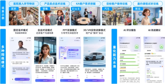 目前全面应用在医药代表面向医院准入环节特训、零售行业顾客接待训练、to B销售客户需求挖掘等销售实战场景,学员与AI模拟的各类画像客户实战沟通、刻意训练,以提升销售实战技能。