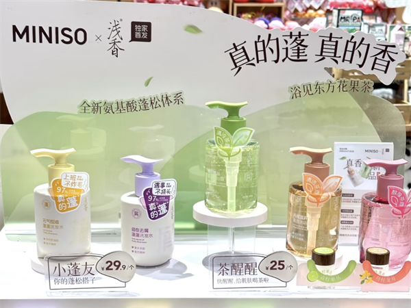 在渠道策略上,浅香同样表现出差异化思维。2025年4月,浅香在名创优品4000+门店首发"小蓬友"洗发水和"茶醒醒"沐浴露。作为快时尚零售品牌,名创优品的消费群体以年轻人为主,与浅香的目标用户高度重合。这种渠道选择,既是对线下零售价值的重新认识,也是年轻化策略的重要体现。