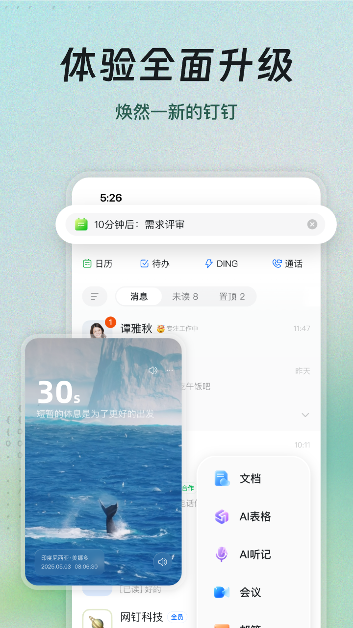 打开钉钉8.0鸿蒙版,全新的UI界面让各项功能一目了然,更能帮你智能规划工作的优先级。比如在你赶往会议室的路上,钉钉8.0鸿蒙版左上角便会弹出一条智能提醒:“10分钟后视频会议即将开始”。这正是钉钉8.0新增的“AI效率岛”功能,能够基于使用场景,智能识别并提醒重要日程、待办和场景需求,就像一个贴心助理。