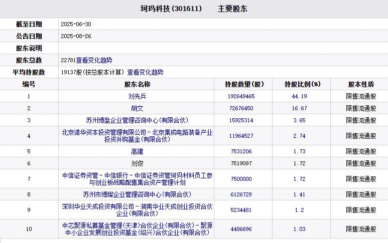 公司8月19日披露关于员工战略配售资管计划减持股份预披露的公告,持有公司股份7,500,000股(占总股本比例1.7202%)的股东中信证券资管-中信银行-中信证券资管珂玛材料员工参与创业板战略配售集合资产管理计划(简称“员工战略配售资管计划”)计划在公告披露之日起15个交易日后的3个月内(自2025年9月10日至2025年12月9日)以大宗交易方式或集中竞价交易方式减持本公司股份不超过7,500,000股(占公司总股本比例 1.7202%)。本次拟减持股东为员工战略配售资管计划。该计划系公司首次公开发行股票时,高级管理人员与核心员工为参与战略配售所设立的专项资产管理计划,认购公司首次公开发行股份7,500,000股,占总股本的比例为1.7202%。2025年8月18日,该股份解除限售并上市流通。截至目前,员工战略配售资管计划持股7,500,000股,占公司总股本比例1.7202%,不存在质押、冻结情形。减持原因系员工战略配售资管计划持有人的自身资金需求,股份来源系公司首次公开发行股票。