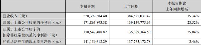 据公司2025年半年报,报告期内,公司实现营业收入5.20亿元,同比增长35.34%;归属于上市公司股东的净利润1.72亿元,同比增长23.52%;扣除非经常性损益后的净利润1.71亿元,同比增长25.04%;经营活动产生的现金流量净额1.41亿元,同比增长2.46%。