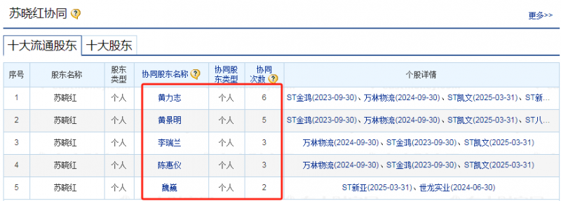 同时,进一步查阅新进的5名股东,其持股偏好高度类似,多次同进同出(来源:东方财富网),疑似“协同股东”,并且这几位疑似协同股东过往的操作标的主要以ST股为主。