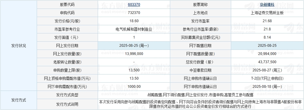 华新精科于2025年8月22日发布的首次公开发行股票并在主板上市发行公告显示,按本次发行价格18.60元/股和4,373.7500万股的新股发行数量计算,若本次发行成功,预计华新精科募集资金总额为81,351.75万元,扣除8,632.79万元(不含增值税)的发行费用后,预计募集资金净额为72,718.96万元(如有尾数差异,为四舍五入所致)。