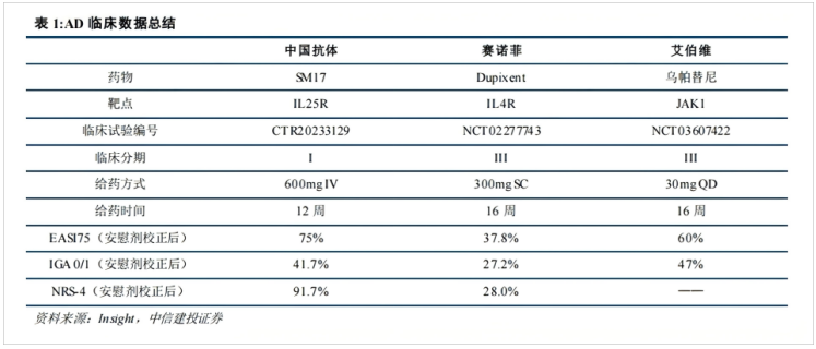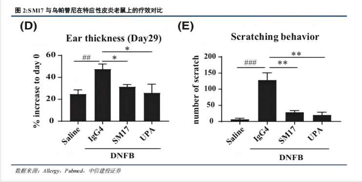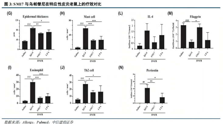 在产品研发方面,研报特别强调了SM17的进展。作为全球针对IL-25受体的抗体药物,SM17在特应性皮炎的Ib期临床试验中表现优异:接受600mg剂量静脉注射12周后,EASI75应答率达到75%,EASI90和IGA 0/1均为41.7%,疗效显著,且与剂量呈现明确的量效关系。这一结果在同类产品中具有差异化优势,未来有望填补现有皮下制剂疗法的空缺,II期临床数据值得重点关注。此外,临床前研究显示,SM17在炎症因子抑制上优于同类药物乌帕替尼,进一步印证了其潜在的竞争力。