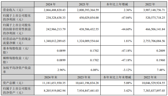 捷成股份2024年年度报告显示,2024年,公司实现营业收入28.66亿元,同比增长2.36%;归属于上市公司股东的净利润连续2年下滑,2022年至2024年分别为5.21亿元、4.50亿元、2.38亿元;归属于上市公司股东的扣除非经常性损益的净利润连续2年下滑,2022年至2024年分别为4.67亿元、4.39亿元、2.43亿元。