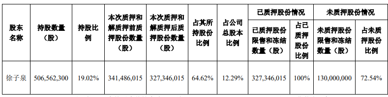 捷成股份8月7日发布的关于控股股东部分股份质押和解除质押的公告显示,截至公告披露日,控股股东徐子泉共持有公司股份506,562,300股,379,921,725股处于限售状态(高管锁定股),累计质押股份327,346,015股,冻结股份130,000,000股。
