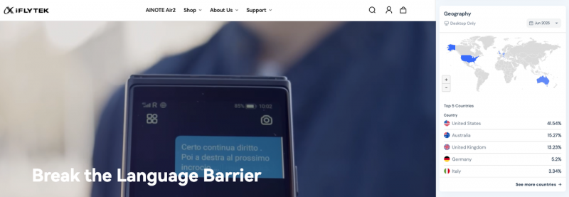 当科大讯飞依托SHOPLINE开启全球化征程时,初期仅配置单一国际站(美元结算/英语界面),但随着产品行销全球30余国,iFLYTEK逐步在SHOPLINE架构内开通澳洲、加拿大、英国、意大利等精细化子市场,摒弃传统多域名站点(如iflytek.de/.fr/.uk独立运营)的模式,转而通过统一站点驱动全球本地化体验升级。