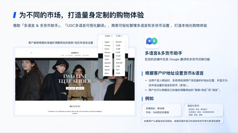 SHOPLINE的多市场解决方案能帮助商家在同一个站点内完成识别、设置、推出、优化和管理国际市场等任务,轻松管理多语言和多货币设置,以更加本地化的方式(国际域名,多语言、多币种)进行销售,提高各国市场的交易转化率,实现一店卖全球。