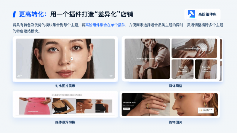 SHOPLINE为商家提供「高阶组件库」,将特色与优势模块集合于单一插件。iFLYTEK灵活选用并跨主题组合多样建站模块,实现真正的个性化与差异化装修。