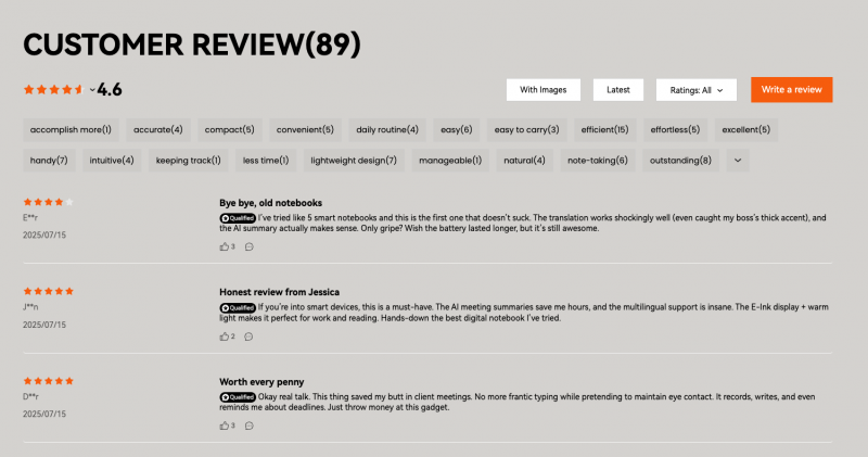 同时,借助SHOPLINE“商品评价”插件,将商品使用评价直观呈现在商品详情页,按清晰的标签分类,呈现优质评价。