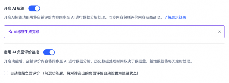 值得一提的是,SHOPLINE支持商家一键开启AI评价标签,还可以启用AI负评监控,并对恶意评价自动进行隐藏,这些真实的消费者声音极具说服力,是转化的重要推力,同样品牌口碑稳定的关键保障。