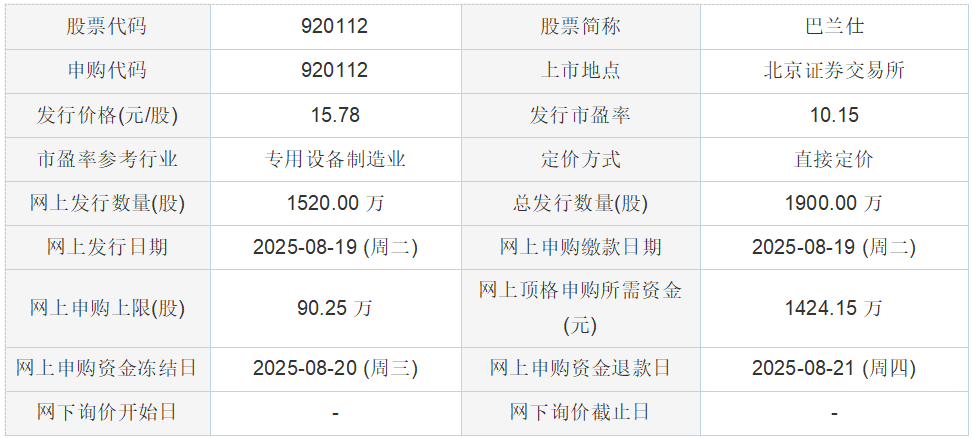 巴兰仕2025年8月15日披露的向不特定合格投资者公开发行股票并在北京证券交易所上市发行公告 显示,若本次发行成功,超额配售选择权行使前,预计公司募集资金总额29,982.00万元,扣除发行费用4,163.37万元(不含增值税)后,预计募集资金净额为25,818.63万元;若超额配售选择权全额行使,预计公司募集资金总额为34,479.30万元,扣除发行费用4,568.15万元(不含增值税),预计募集资金净额为29,911.15万元。