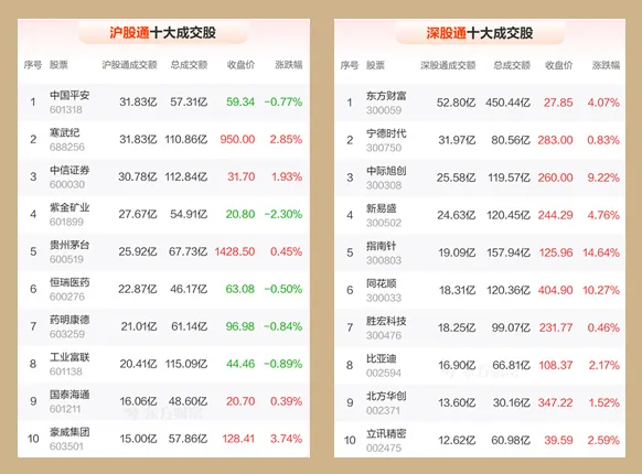 4、北向资金共成交3694.87亿元,占两市总成交额的13.37%——