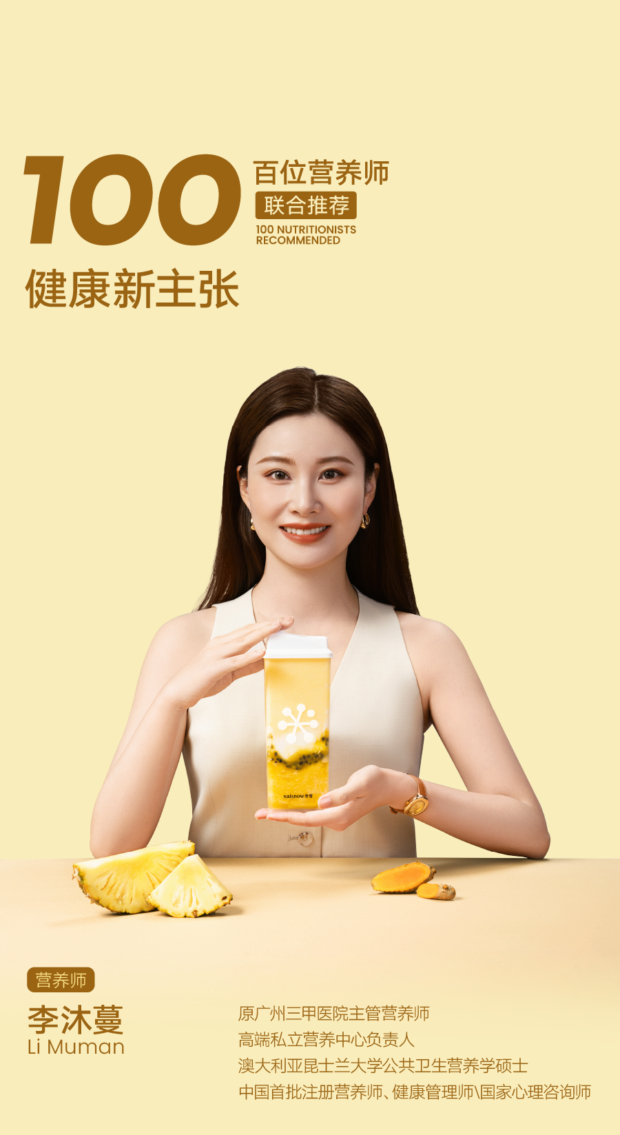 作为奈雪“天然营养 +”计划的重要落子,“阳光金凤梨姜黄酸奶昔” 凭借科学的食材搭配与明确的健康价值,获中国首批注册营养师、健康管理师李沐蔓的特别推荐。这款酸奶昔巧妙融合被誉为“植物黄金”的姜黄,与菲律宾进口金凤梨、黄金百香果及千亿活菌酸奶,构建起“抗氧+抗炎”的双效营养体系,同时兼顾丰富口感。