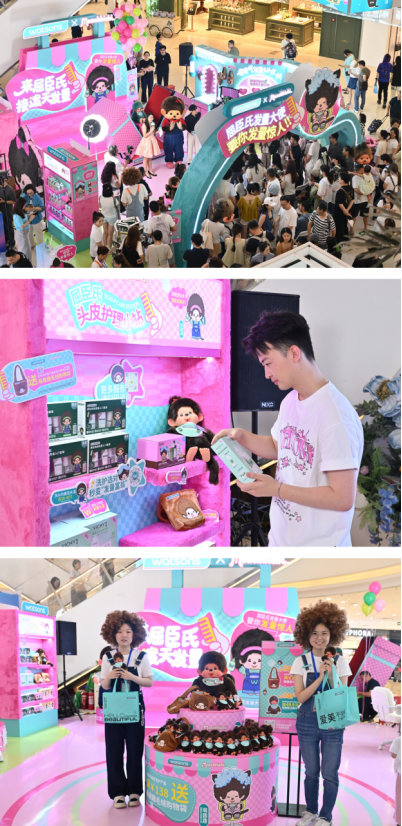 为让更多消费者感受到萌趣趣的蓬松发量魅力,屈臣氏于上海、成都多地同步推出萌趣趣主题门店。主题店内特别设有头皮和头发护理小站,缤纷夺目的陈列搭配萌趣趣标志性的蓬松感头发和爆炸头发型道具,打造一个轻松治愈、兼具活泼俏皮氛围的购物空间。屈臣氏更联合多个护发品牌推出联名护发套组等,涵盖护发精油、护发素、发膜、洗发水等丰富品类,为消费者在炎炎夏日提供一站式护发解决方案。