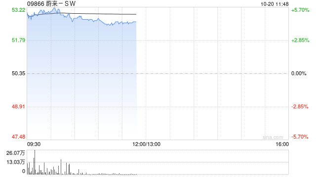 蔚来-SW(09866)盘中涨超5%,截至发稿,股价上涨4.37%,现报52.55港元,成成交额1.65亿港元。