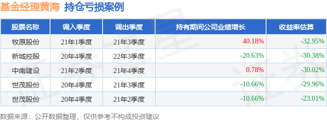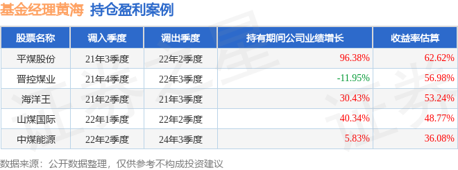 重仓股调仓示例详解: 1、平煤股份(601666)调仓案例: 黄海管理的万家新利灵活配置混合基金在21年3季度买入平煤股份,在持有3个季度后在22年2季度卖出。持有期间的估算收益率为62.62%,持有期间平煤股份在2021年到2022年的年报归属净利润增幅达96.38%。 2、晋控煤业(601001)调仓案例: 黄海管理的万家精选混合A基金在21年4季度买入晋控煤业,在持有3个季度后在22年3季度卖出。持有期间的估算收益率为56.98%,持有期间晋控煤业在2021年到2022年的年报营业总收入降幅为11.95%。 3、牧原股份(002714)调仓案例: 黄海管理的万家新利灵活配置混合基金在21年1季度买入牧原股份,在持有2个季度后在21年3季度卖出。持有期间的估算收益率为-32.95%,持有期间牧原股份在2020年到2021年的年报营业总收入增幅达40.18%。