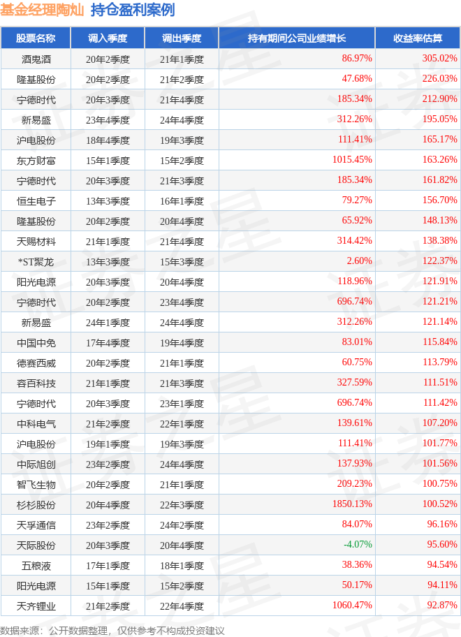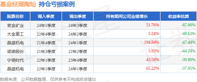 重仓股调仓示例详解: 1、酒鬼酒(000799)翻倍案例: 陶灿管理的建信现代服务业股票基金在20年2季度买入酒鬼酒,在持有3个季度后在21年1季度卖出。持有期间的估算收益率为305.02%,持有期间酒鬼酒在2020年到2021年的年报营业总收入增幅达86.97%。 2、天孚通信(300394)调仓案例: 陶灿管理的建信改革红利股票A基金在23年2季度买入天孚通信,在持有1年又0个季度后在24年2季度卖出。持有期间的估算收益率为96.16%,持有期间天孚通信在2023年到2024年的年报归属净利润增幅达84.07%。 3、紫金矿业(601899)折戟案例: 陶灿管理的建信高股息主题股票基金在24年1季度买入紫金矿业,在持有2个季度后在24年3季度卖出。持有期间的估算收益率为-87.8%,持有期间紫金矿业在2023年到2024年的年报归属净利润增幅达51.76%。