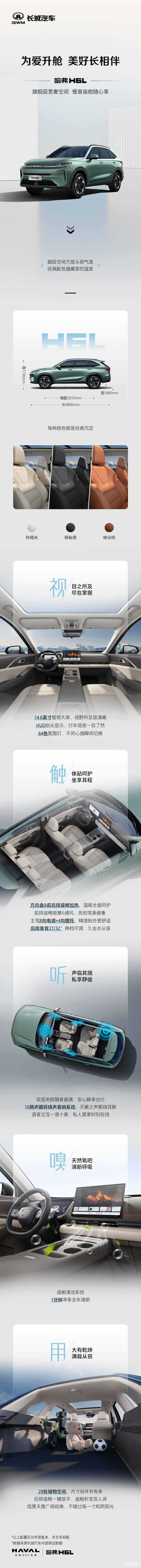 具体来看,新车内饰提供秋褐米、探秘黑、峡谷棕三种配色,配备14.6英寸中控屏、HUD抬头显示、64色氛围灯、方向盘及前后排座椅加热、前排座椅通风按摩、主驾8向电调和4向腿托、后排靠背27°和32°调节、双层夹胶玻璃、10扬声器环绕声音响系统、座舱清洁系统、28处储物空间、后排座椅一键放平、全景天窗等。