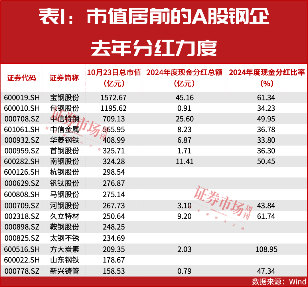 从涨幅领先的钢企来看,普遍具有分红率较高、负债率表现稳健的特点。比如宝钢股份(600019.SH)、中信特钢、南钢股份2024年度的现金分红比率分别达到61.3%、50%、50.4%。分红金额上,三家公司2024年度现金分红45.1亿元、25.6亿元、11.4亿元,在A股钢企中排名前三。三家公司资产负债率还在60%左右或更低(截至今年6月末)。