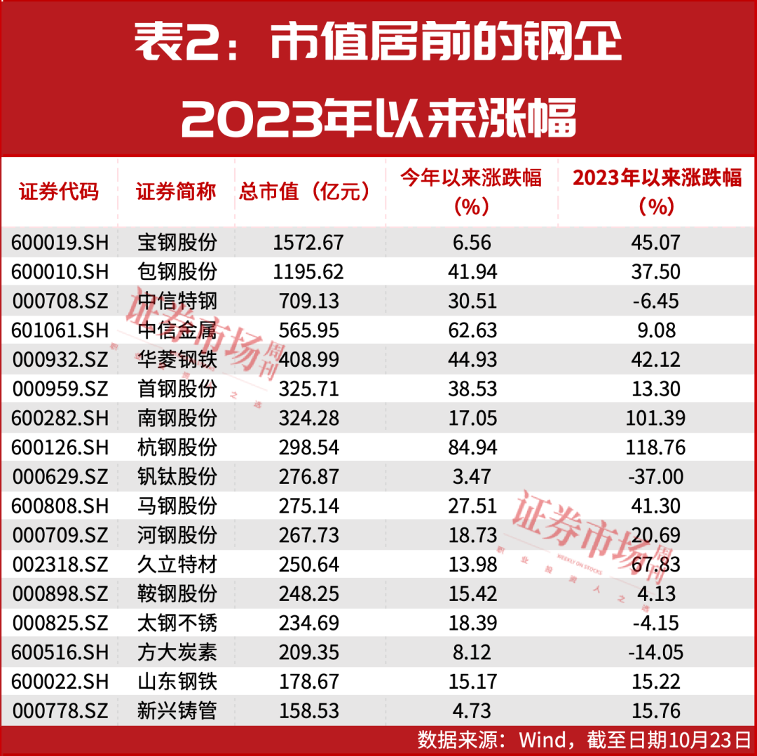 今年以来,钢铁板块走出慢牛行情。Wind显示,钢铁股精选指数今年以来涨幅达24.4%(数据截至10月23日,下同)。在钢铁行业整体产能过剩、业绩承压的背景下,具备较强抗周期性能力的钢企主要集中于特钢、不锈钢,或东部沿海地区的地域性钢企,部分企业还兼营稀土等高价值业务。其中,武进不锈(603878.SH)今年涨幅达101%;柳钢股份(601003.SH)、杭钢股份(600126.SH)涨幅分别为92.4%、84.9%;中信金属(601061.SH)涨幅为62.6%。