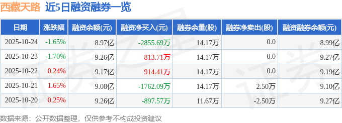 西藏天路融资融券信息显示,融资方面,当日融资买入4933.17万元,融资偿还7788.86万元,融资净偿还2855.69万元。融券方面,融券卖出0.0股,融券偿还0.0股,融券余量14.17万股,融券余额168.91万元。融资融券余额8.99亿元。