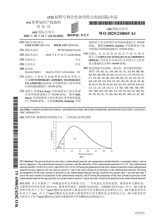 证券之星消息,根据企查查数据显示宁德时代(300750)公布了一项国际专利申请,专利名为“碳基材料及其制备方法、二次电池以及用电装置”,专利申请号为PCT/CN2024/112176,国际公布日为2025年10月23日。