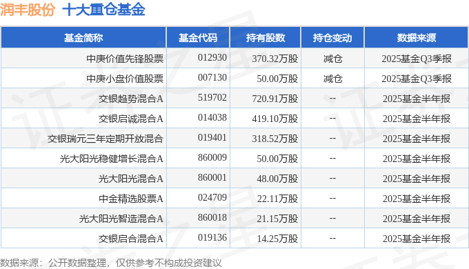 持有润丰股份最多的基金为中庚价值先锋股票,目前规模为32.36亿元,净值1.0744(10月24日),较上一交易日下跌0.48%,近一年上涨13.72%。该基金现任基金经理为陈涛。