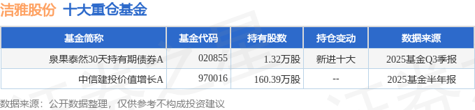 持有洁雅股份最多的基金为泉果泰然30天持有期债券A,目前规模为0.51亿元,净值1.039(10月24日),较上一交易日上涨0.08%,近一年上涨3.22%。该基金现任基金经理为钱思佳 徐缘。