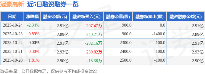 冠豪高新融资融券信息显示,融资方面,当日融资买入1384.52万元,融资偿还1177.05万元,融资净买入207.47万元。融券方面,融券卖出0.0股,融券偿还0.0股,融券余量900.0股,融券余额0.3万元。融资融券余额2.91亿元。