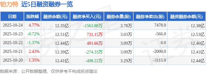 铂力特融资融券信息显示,融资方面,当日融资买入3659.63万元,融资偿还5223.52万元,融资净偿还1563.88万元。融券方面,融券卖出7678.0股,融券偿还200.0股,融券余量3.78万股,融券余额268.4万元。融资融券余额12.38亿元。