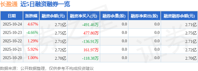 长盈通融资融券信息显示,融资方面,当日融资买入1924.71万元,融资偿还2416.16万元,融资净偿还491.46万元。融券方面,融券卖出0.0股,融券偿还0.0股,融券余量0.0股,融券余额0.0万元。融资融券余额2.71亿元。