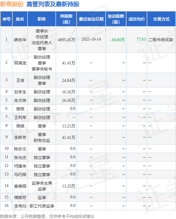 新泉股份的高管列表及持股情况如下: