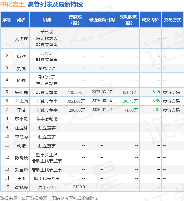 中化岩土近半年内的董监高及核心技术人员增减持详情如下: